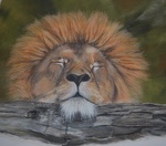 2009De leeuw, bekend om zijn woeste, krachtige uiterlijk.. Hier slapend met zijn machtige kop op een boomstam... Hij heeft zo iets heel liefs over zich (alsof je hem zo kunt aaien)